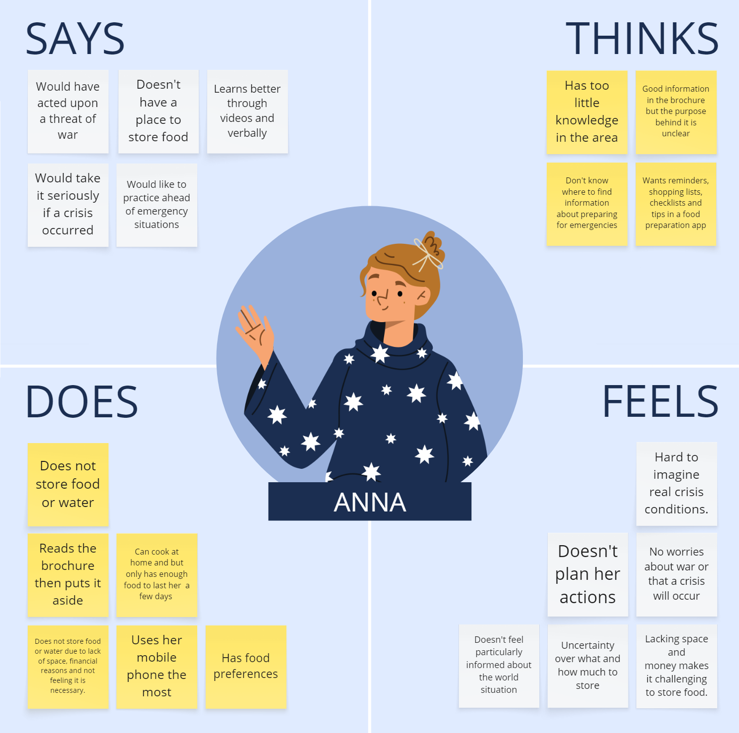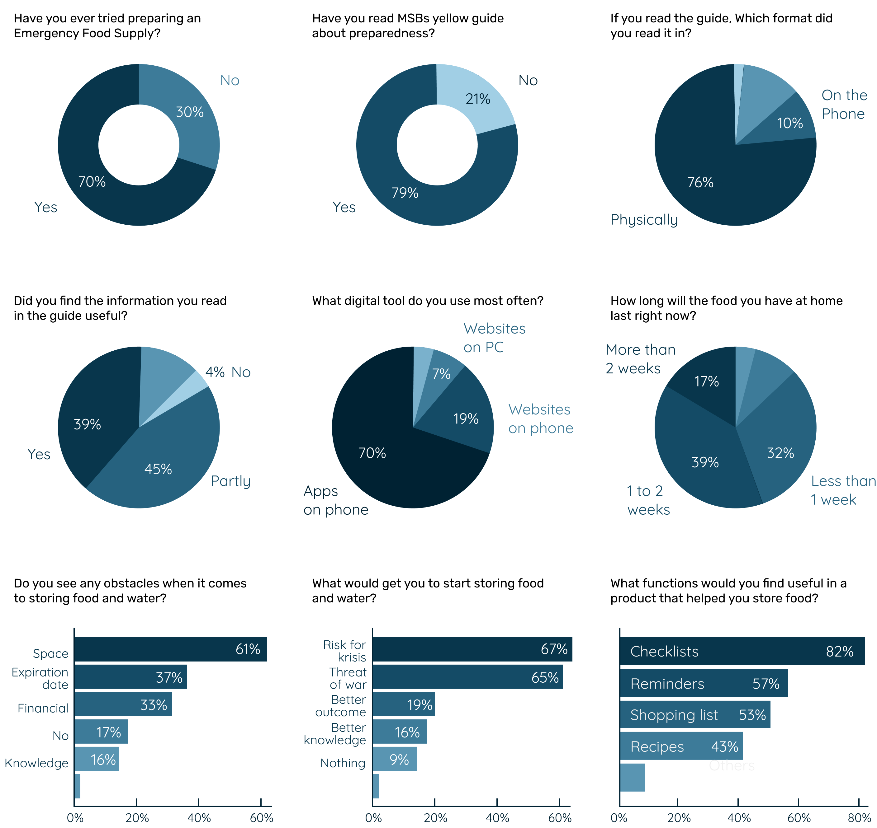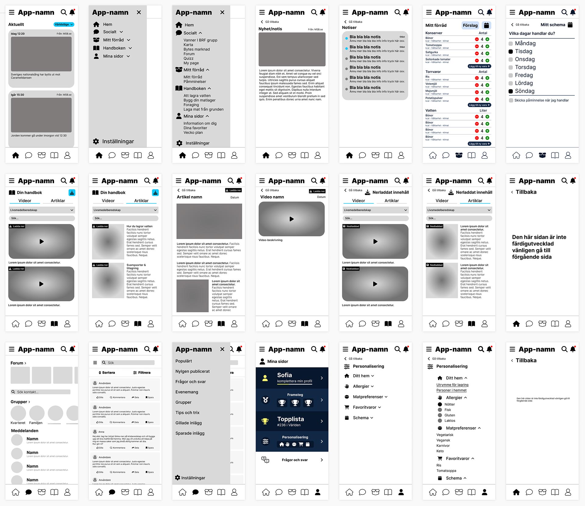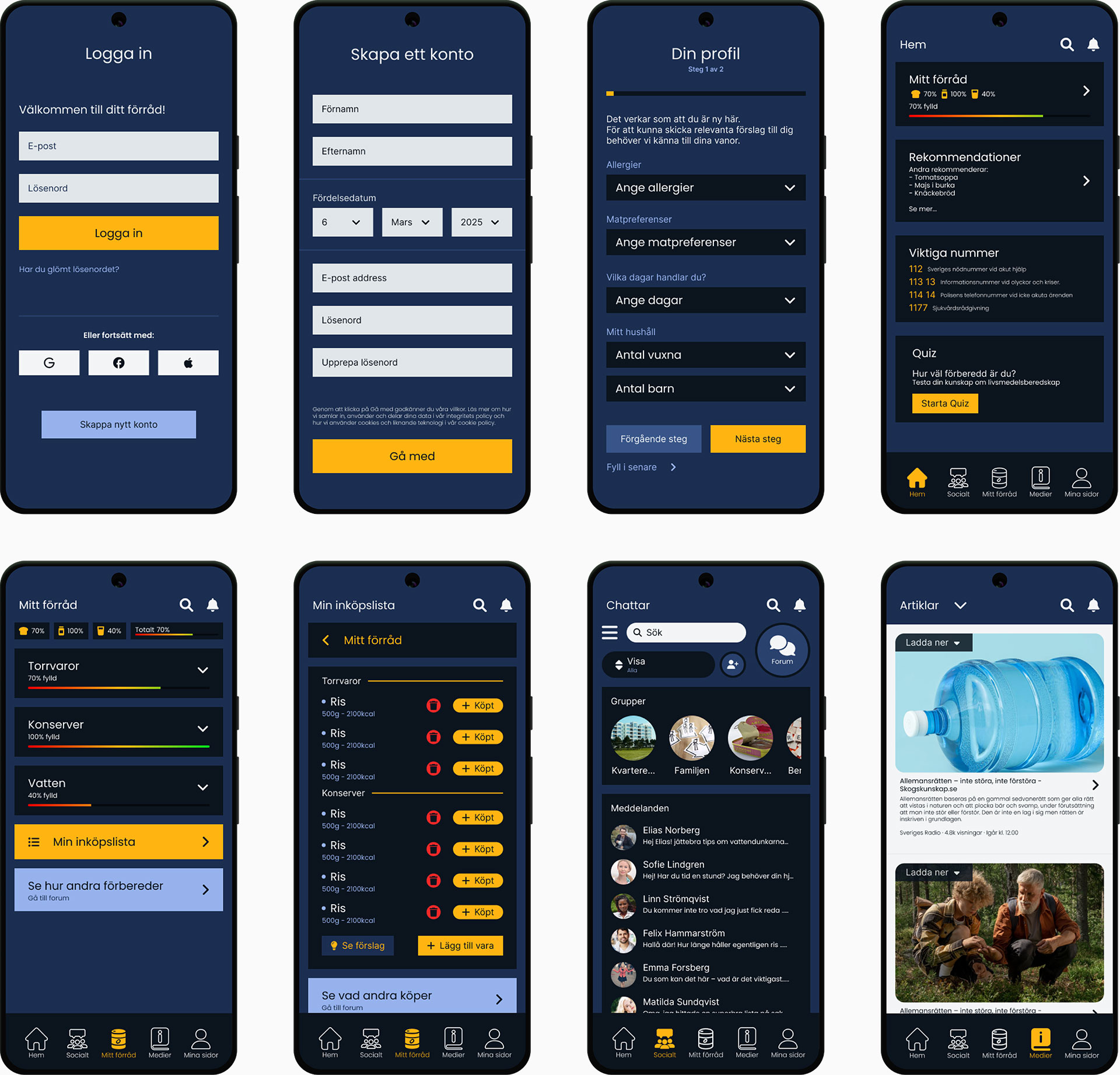 Our hope with this service is to guide people to be more engaged in their own safety during emergencies, which would also help Sweden as a whole to be more prepared to better weather the storm. To achieve that we took the results of our research and created this app we called “Mitt förråd”, which features several functions that will help our users achieve their goals. After several iterations and 2 rounds of user testing we were able to get to this prototype.